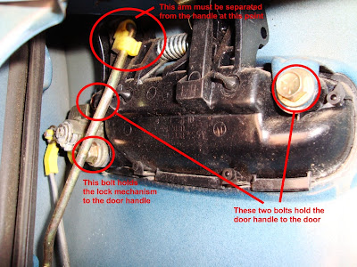 March 7, 2009About six months ago while I was in Statics class at Piedmont Tech, some punk tried to break into my car by forcing the door handle open. They were unsuccessful, but they broke the plastic lever of the door handle off and I've been forced to use two hands to pry open my door every time I entered my car since then. That was especially annoying when I was carrying something and it was raining.